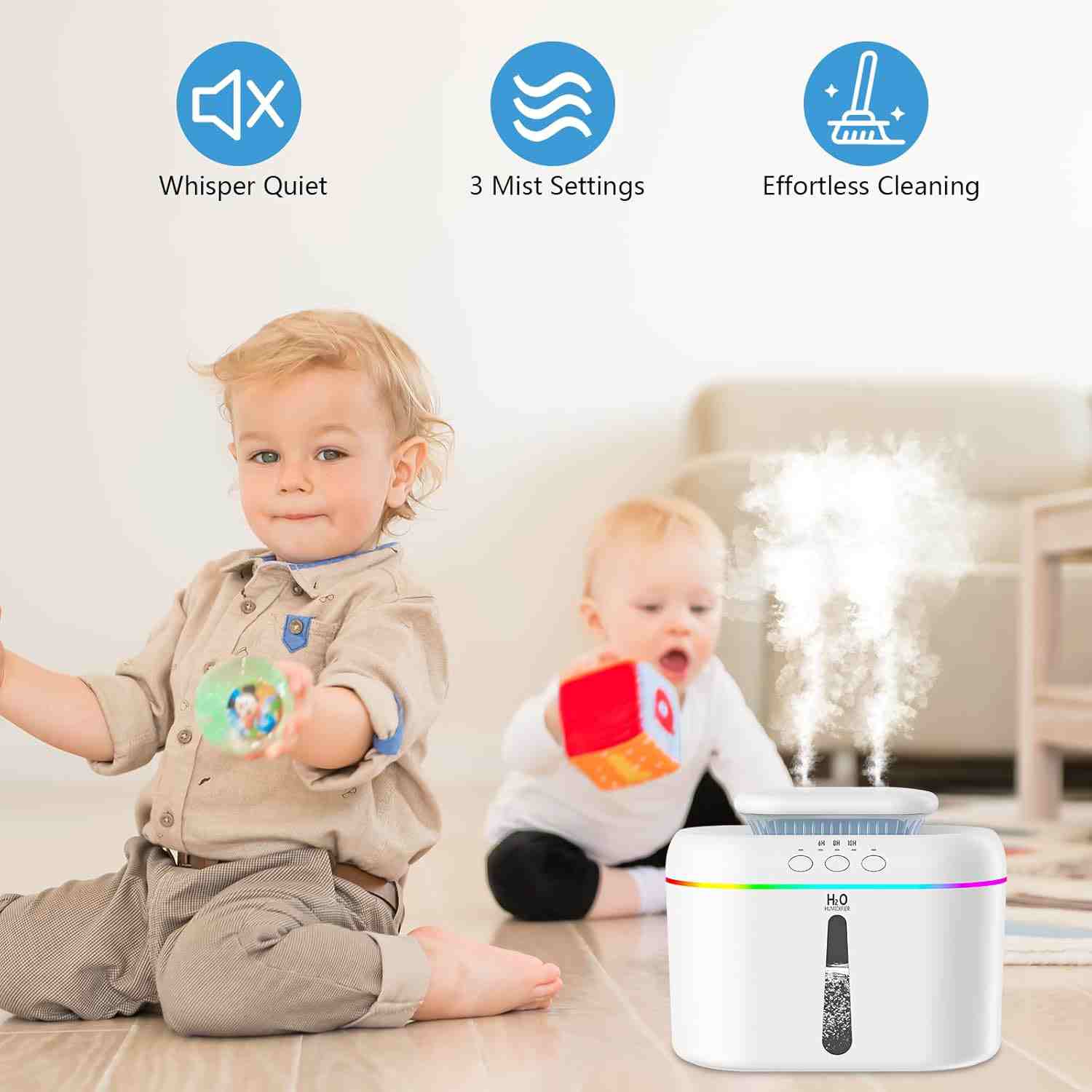 Ultra-quiet operation (≤28 dB), soft night light, and 3 mist modes for personalized humidity in any space.