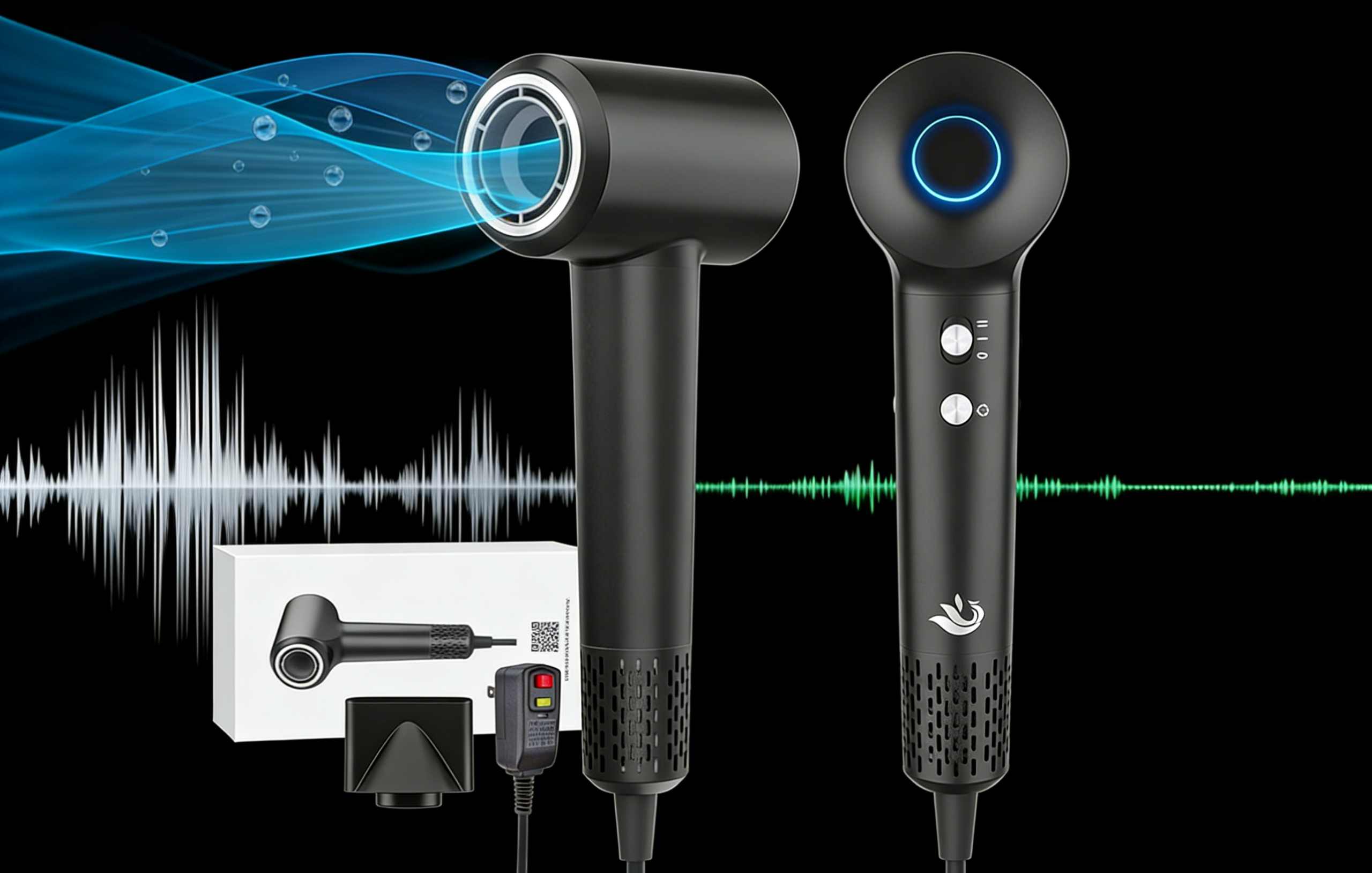110,000 RPM motor, 22 m/s airflow, dries hair in 2–5 minutes.